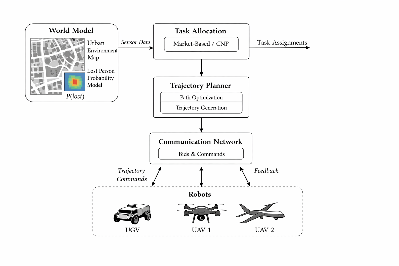 - Implemented decentralized market-based approach using K-Nearest Neighbors clustering and probabilistic lost person models to optimize trajectory planning for UAV and UGV search agents.